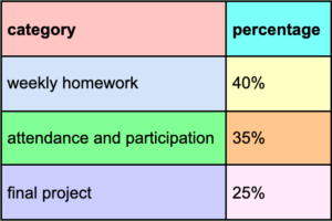 Every week you will be asked to respond to the readings and discussions from class. The last 3 weeks will be focused towards developing a final project. We will turn in homework using a google form before class starts. If you turn in your homework before midnight on Wednesday, I will be better able to provide you feedback.
